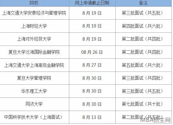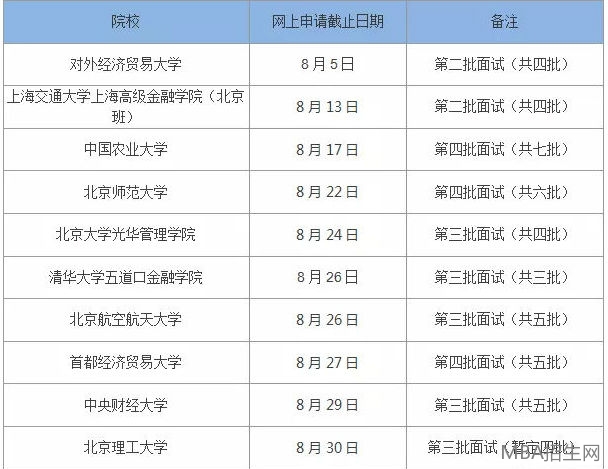 轉眼間2018年已經已進入到8月份,對于備考MBA的朋友們來說,留給你們的時間真的不多了,拿到提前批面試offer的,一定要制定計劃復習筆試了,而還在迷茫擇校的,不如再問問自己,為什么要考MBA?如果你想得明白,別多耽誤了,要抓緊申請面試了。8月份這些院校的面試又將截止一批: