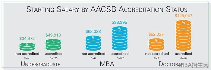 當學歷再上升一級,非AACSB院校畢業的博士生,平均年薪為5萬2千美金,而AACSB院校畢業的博士生薪資則超過前者的2倍多,高達12萬5美金。就這份數據我們可以得出至少三個結論:1.MBA畢業生薪資遠遠高于本科生 2.無論在哪個學歷階段,AACSB院校的畢業生薪資均比非AACSB院校高。 3.學歷越高,AACSB和非AACSB院校的畢業生薪資差距越大。ACSB的認證對于學員薪資影響如此之大?首先讓我們來了解什么是AACSB認證。