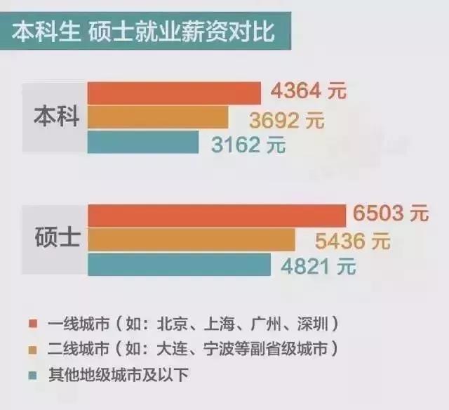 分析:整體來說,碩士薪資比本科薪資要高出一個檔次。尤其是在一線城市,6503元的薪酬雖然不能做到存下錢,但至少可以做到衣食無憂。