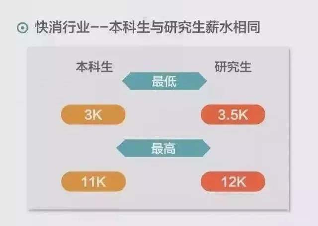 分析:快消行業本科生和碩士薪資基本相同,讀研并不能帶來起薪上的顯著提高。因此,快消行業的同學們如果單純只是為了提高工薪,還是盡量放棄考研的想法吧,踏踏實實找工作才是最重要的。