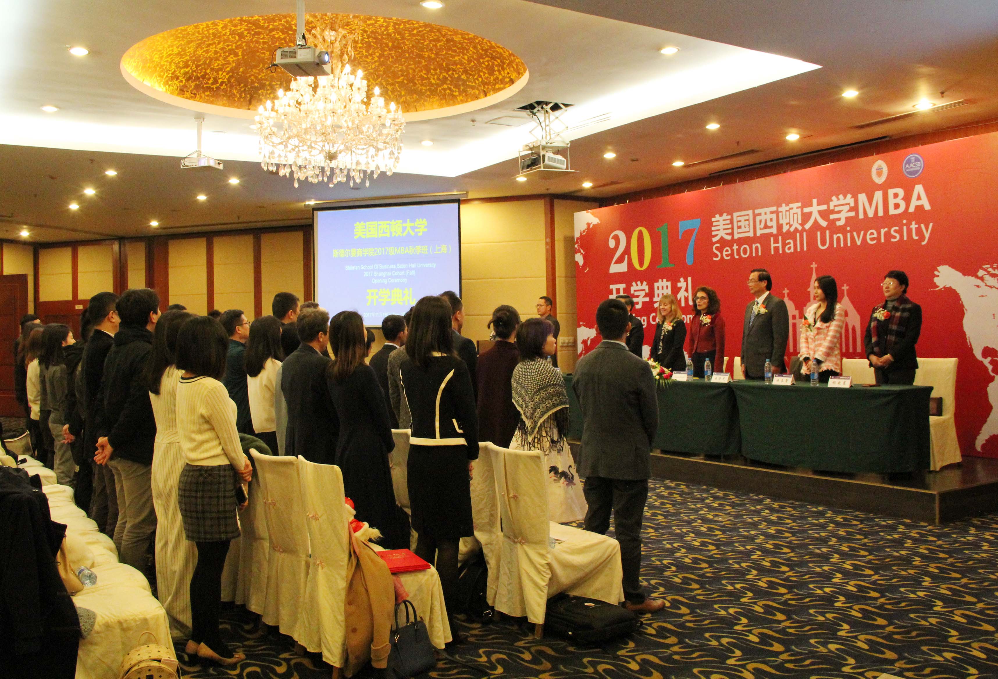 典禮開始,全體成員起立,中美兩國國歌奏起,在莊嚴的國歌聲中,開學典禮正式開始,預示著即將入學的學員將要開啟人生新的篇章。國歌校歌儀式之后,美國西頓大學MBA上海班施隆光博士,美國西頓大學(Seton Hall University)執行副校長兼教務長Karen Boroff,斯德爾曼商學院院長Joyce Strawser,斯德爾曼商學院副院長尹尊聲教授及新老學員相繼發言。