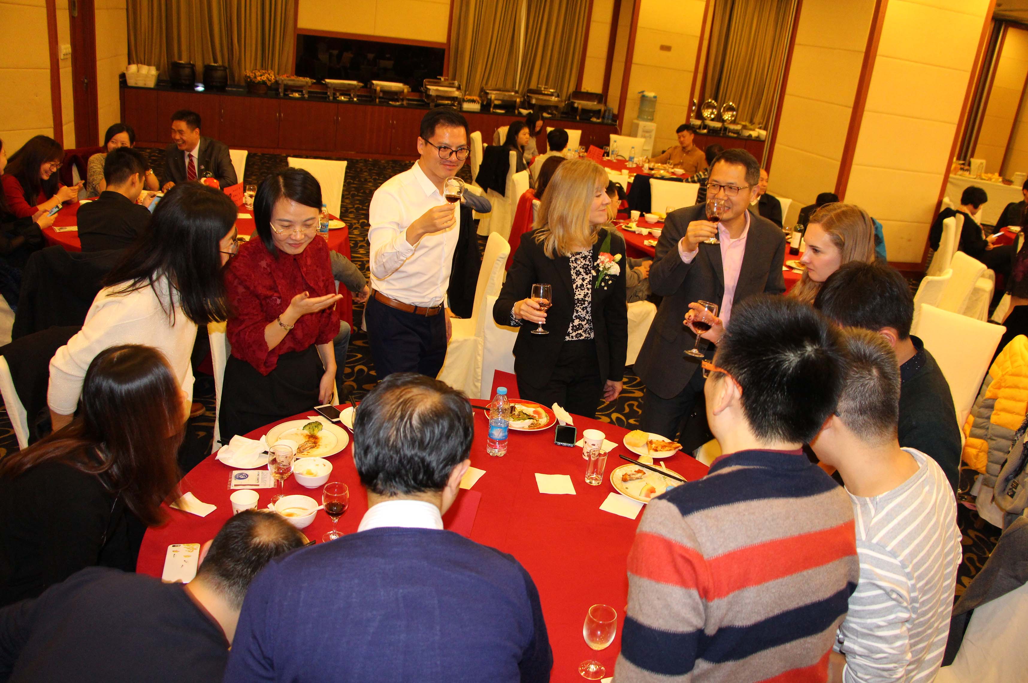 開學典禮發言環節結束,自助晚宴開始,學員之間舉杯并親密交談。