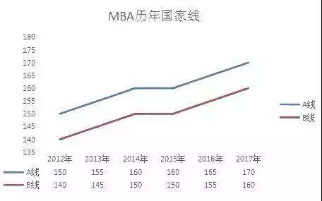 分析:通過近6年MBA國家線的折線圖可以看出A線、B線平穩增長,趨于穩定。雖然期間報考人數和實考人數的大幅增加,并未帶來A線、B線的大幅增加,說明沒有認真復習的大有人在,所以認真備考實為成功利器。