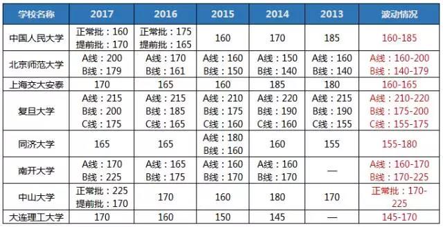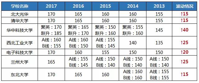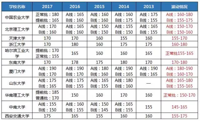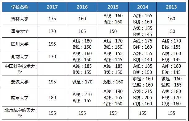 分析:這類分數線沒什么規律,比如北航,簡直屬于風雨不動安如山,五年來毫無變化;比如中國科學技術大學去年的分數線是基礎分數線125,某項復試分數線是205;比如南京大學B線從13年的170漲到205又降到165再到變不見,真的是,院校大佬,你開心就好。