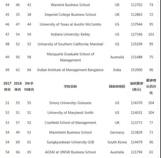 我們可以看到排名前十的商學院,畢業生薪水漲幅都在90%以上,事實上排名前100的商學院,最低的薪水漲幅也在60%以上,而最高的超過150%,有超過50家的畢業生薪水漲幅都超過100%。