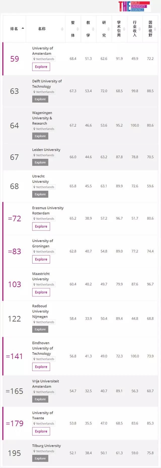 參加全球大學排名的荷蘭研究型大學常年表現優異。在今年《世界大學排名》中,更以荷蘭13所研究型綜合大學全部入選世界200強、歐洲100強的驕人成績,再次印證了業內對荷蘭擁有“全球最具價值高等教育體系”的贊譽。