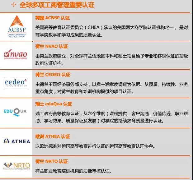 BSN 荷蘭商學院擁有美國 ACBSP、荷蘭 NVAO、瑞士 eduQua、歐洲 ATHEA 等多項全球工商管理重要認證;2016 年 2 月,被英國著名《CEO》雜志評選為歐洲一流工商管理學位項目。