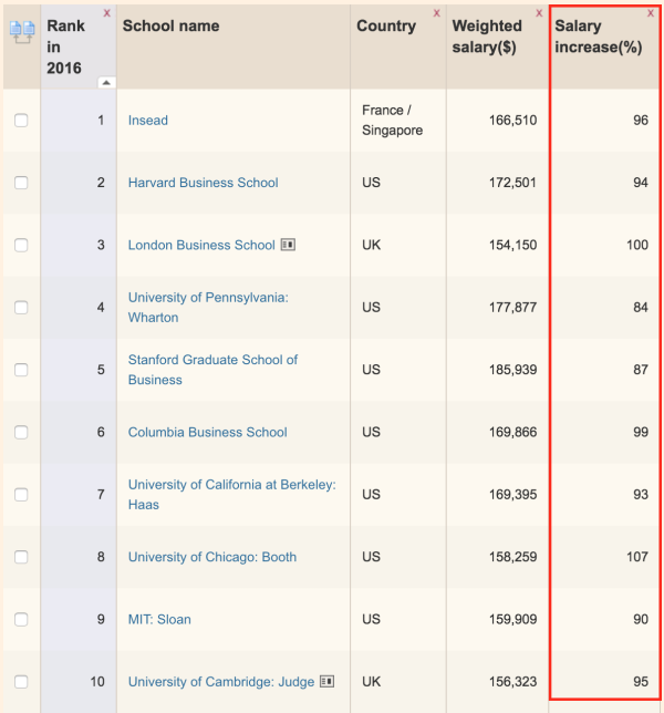 《金融時報》世界排名前10位的商學院平均漲幅為94.5%。