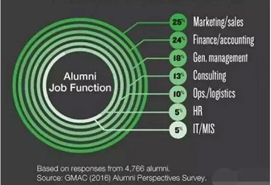 同時,統(tǒng)計結(jié)果還顯示,MBA校友的就業(yè)范圍趨于廣泛,除金融這一雷打不動的輸出方向外,另有七大行業(yè)六大職能吸引MBA畢業(yè)生發(fā)揮光和熱。下面請看具體結(jié)論: