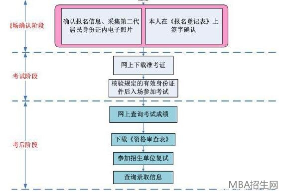 MBA報考流程包括網上報名和現場確認兩個階段。應屆本科畢業生原則上應選擇就讀學校所在省(區、市)的報考點辦理網上報名和現場確認手續。其考生應選擇工作或戶口所在地省(區、市)的報考點辦理網上報名和現場確認手續。