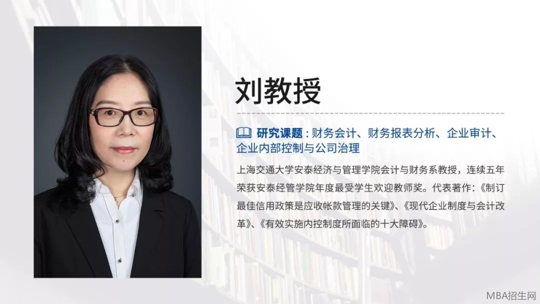 上海交通大學安泰經濟與管理學院EMBA和EDP課程教授,兼任多家大中型企業的公司財務顧問及獨立董事。 長期執教EMBA,EDP《財務會計與決策》、《財務報表分析》和《決策中財務管理》等課程,并連續多年獲得了上海交通大學安泰經濟與管理學院最受歡迎的MBA課程教授、最受歡迎的會計報表分析課程教授。
