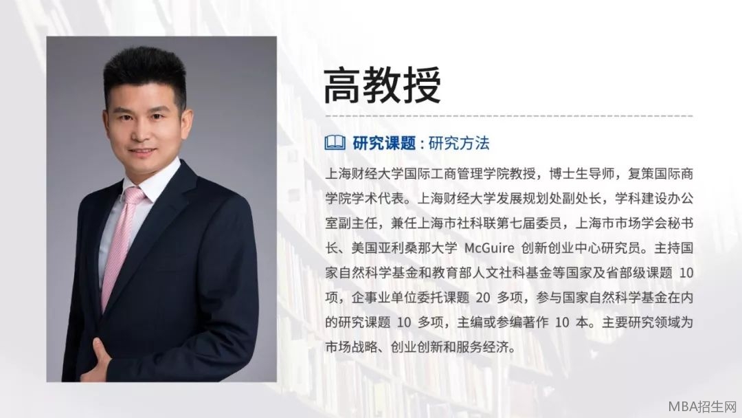 上海財經大學國際工商管理學院,上海財經大學發展規劃處副處長,學科建設辦公室副主任,上海財經大學講席副教授,博士生導師,博士后聯系教授,美國亞利桑那大學McGuire創新創業中心研究員,上海交通大學DBA,清華大學總裁班和國際MBA,上海財經大學MBA和總裁班授課教授。