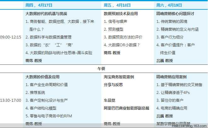另外,我們還將邀請阿里巴巴商業智能部(BI)副總裁前來分享精確營銷的實踐案例,幫助學員理解以大數據和技術驅動的最新營銷策略和實用技術。