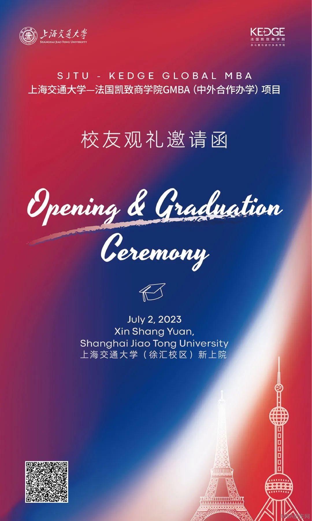 2023上海交大-KEDGE Global MBA畢業暨開學典禮即將于下月啟幕。本次活動特向上海交大-KEDGE Global MBA項目校友開放邀請,歡迎各位校友在這個特別的日子踏入歷經百年依然鮮艷的朱紅,漫步于綠茵間,打卡標志性建筑,共同見證學弟學妹們的難忘瞬間!