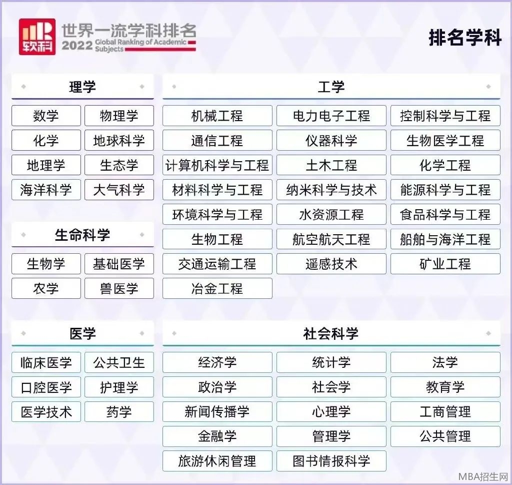 2022年度的《世界一流學(xué)科排名》參考了學(xué)術(shù)發(fā)表的質(zhì)量和數(shù)量,覆蓋了全球54個學(xué)科,涉及5個學(xué)術(shù)領(lǐng)域,共有1,800多所高校入選本次榜單。本次排名覆蓋以下5個領(lǐng)域:
