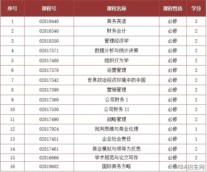 ? 開設(shè)課程:會計學(xué)、應(yīng)用統(tǒng)計學(xué)、規(guī)劃與決策、管理經(jīng)濟(jì)學(xué)、組織行為學(xué)、市場營銷、生產(chǎn)與作業(yè)管理、公司財務(wù)、戰(zhàn)略管理