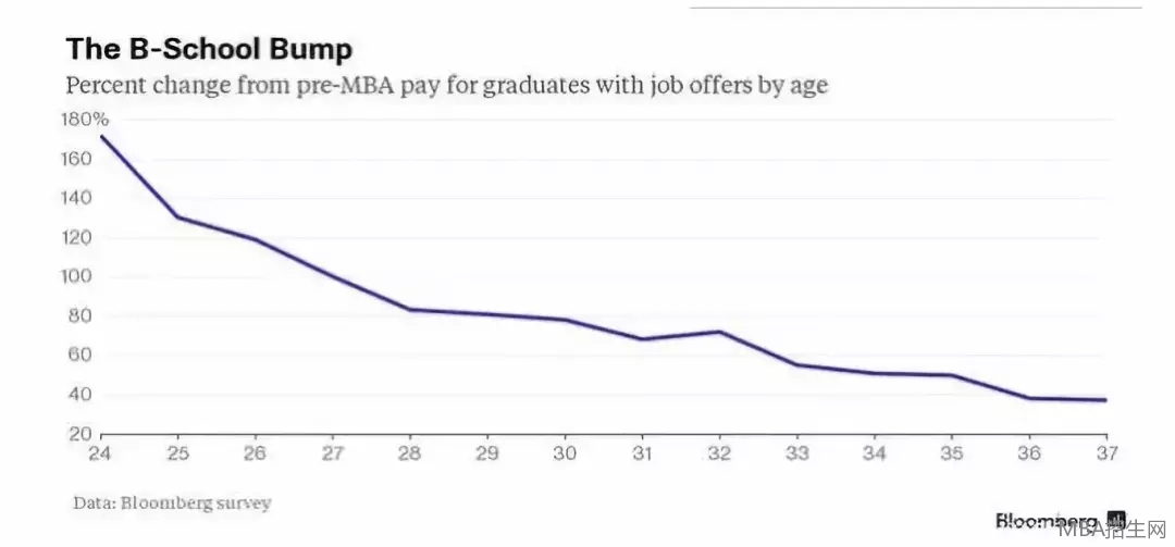 從上圖可以得出,隨著年齡的增長MBA畢業(yè)生薪水的增幅也在下降。圖中還能看出36歲和25歲的MBA畢業(yè)生的薪水比入學(xué)前分別能夠增長約47%和130%。
