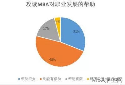 調(diào)查顯示,31%的MBA學(xué)員認(rèn)為攻讀MBA對其職業(yè)發(fā)展幫助很大,48%的學(xué)員認(rèn)為攻讀MBA對其職業(yè)發(fā)展比較有幫助,僅有17%的學(xué)員認(rèn)為對其幫助有限。