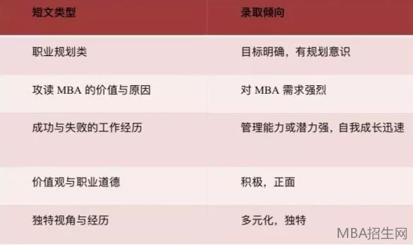 如人大17年申請短文“簡要概述你的短期和長期職業規劃,你認為人大MBA項目將對你實現規劃產生什么作用”;復旦19年“如果您被復旦MBA錄取,請具體談談您的個人學習規劃”;廣東外語外貿17年“我對廣外MBA “微笑”(SMILE)價值觀的理解”;等等。